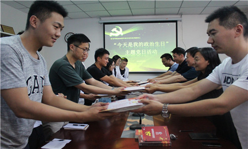 学院党委高度重视党员“政治生日”活动,活动前对6月份入党的同学进行谈心谈话,精心设计制作了政治生日贺卡,挑选了党建教育书籍作为政治生日礼物,提高学生党员对“政治生日”的认识。活动中,学院领导和老师为16名学生党员赠送了“政治生日”贺卡和学习书籍,党员同志们集体宣誓,重温入党誓词,发表生日感言,总结个人大学四年的成长历程,找差距,定方向。