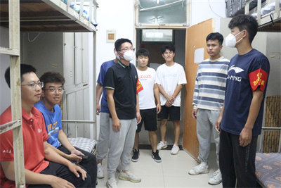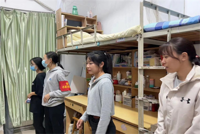 并叮嘱同学们:一是当前疫情防控形势严峻,尤其是国庆假期期间,人员流动频繁、管控难度大,同学们思想上一定不要懈怠,坚决克服麻痹思想、侥幸心理、松劲心态,坚持不给自己添乱、不给学校添乱、严格落实疫情防控常态化要求,坚决做好学院常态化疫情防控工作,牢牢守住学院疫情防控的安全大门。二是要时刻保持宿舍内务环境干净、整洁、无异味,产生的垃圾要及时清除,衣物要摆放整齐,不要随意乱挂。三是人走一定要断电,严禁在宿舍内吸烟、使用大功率电器、电瓶充电等现象发生。四是在此次安全隐患大排查大整治中要整治彻底,人人要争当积极践行的模范员。