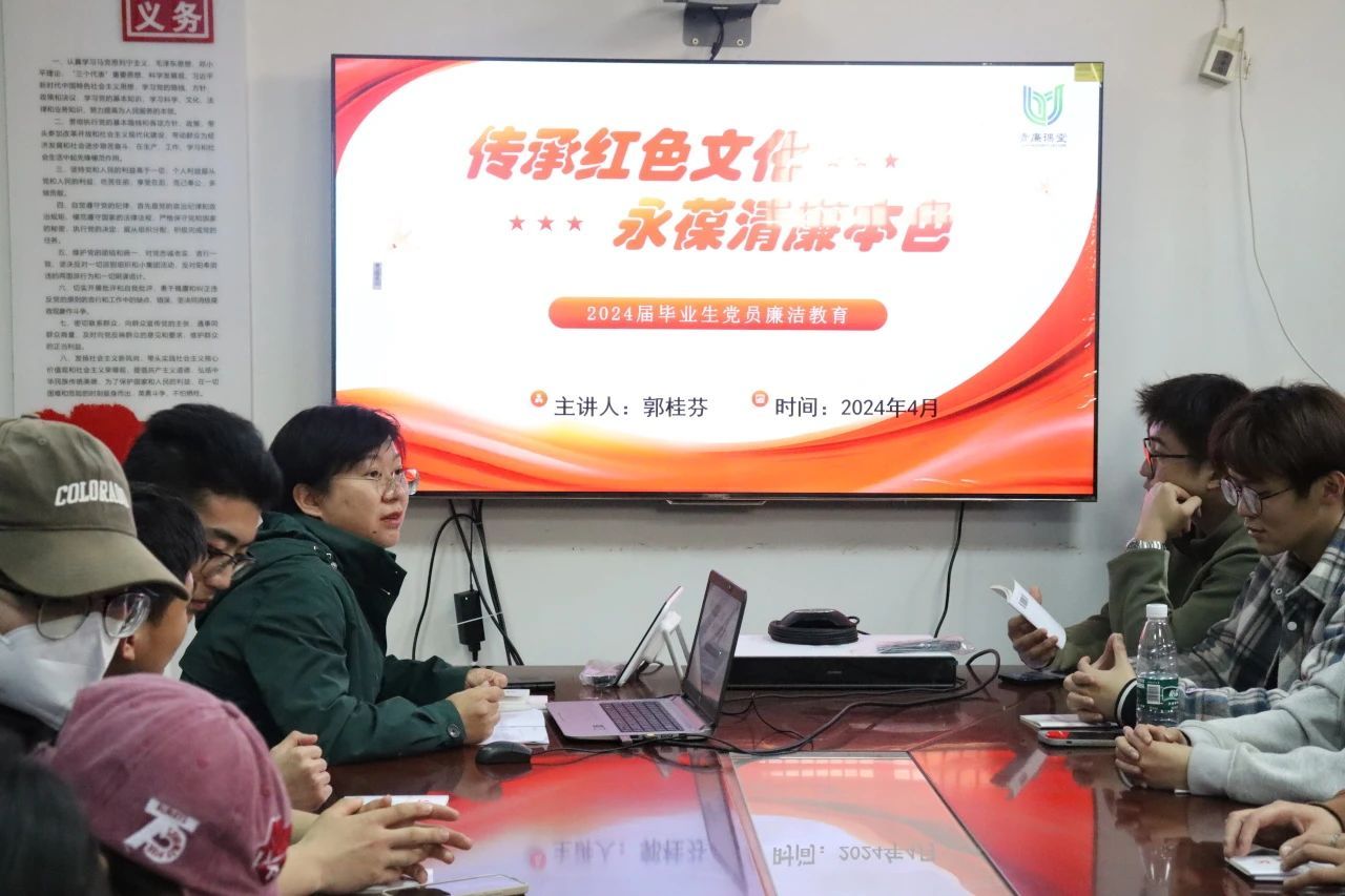 会上,学院党委副书记、副院长郭桂芬以“传承红色文化,永葆清廉本色”为主题,从新时代廉洁文化建设、新时代廉洁文化建设的战略意义、《中国共产党纪律处分条例》学习解读、典型案例警示等四个方面为毕业生党员进行了廉洁教育主题党课。她强调,新修订的《中国共产党纪律处分条例》体现了纪律建设的政治性、时代性、针对性,要带着强烈的政治敏锐感和责任感来学习,始终把规矩、纪律摆在前面,自觉遵守党纪法规,要做到无条件服从,严格执行。同时教育毕业生党员要牢记纪律红线底线、增强自律意识,要自觉遵守廉政准则,切实增强廉洁自律意识,永葆共产党人清正廉洁的政治本色。