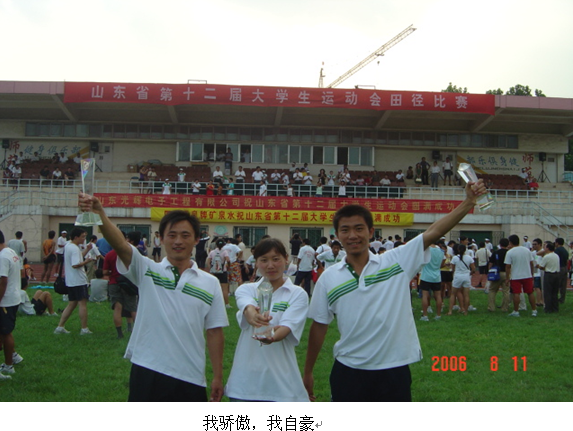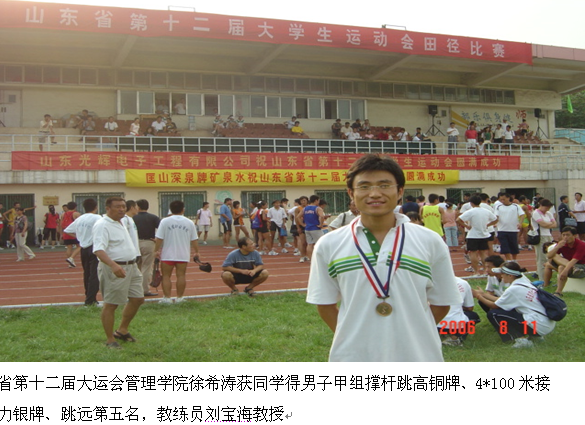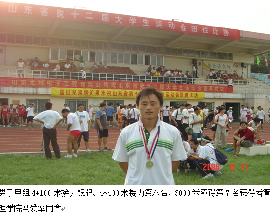 7、山东省第十二届大学生运动会管理学院马爱军获得男子甲组4*100米接力第二名,4*400米接力第八名,3000米障碍第七名。