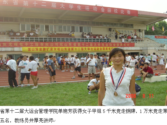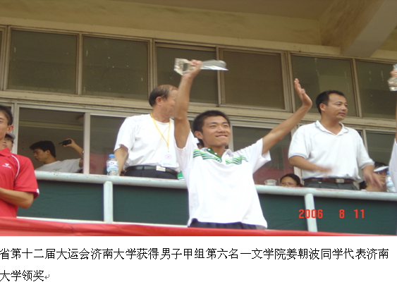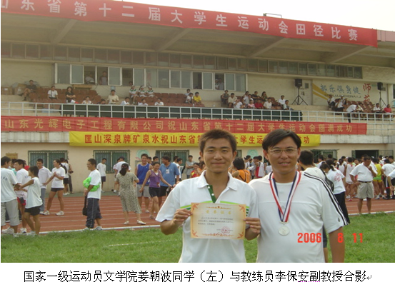 5、山东省第十二届大学生运动会文学院姜朝波获得男子甲组4*100米接力第二名,4*400米接力第八名,100米第四名,成绩10.93秒,获得男子200米第三名,成绩21.87秒,均达到国家一级运动员标准,这是我校有史以来自己培养的第一位国家一级运动员。