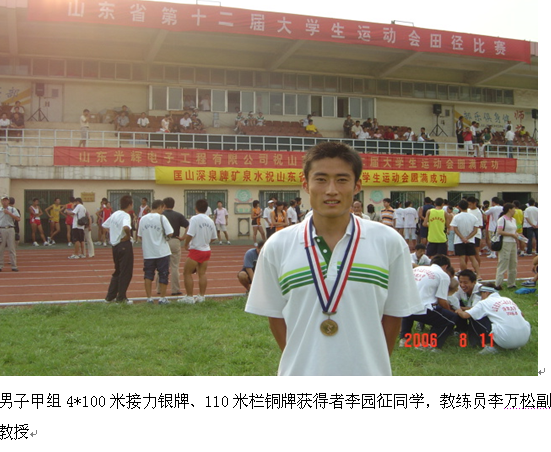 1、第十二届山东省大学生运动会李园征获得男子甲组110米栏第三名,4*100米接力第二名。