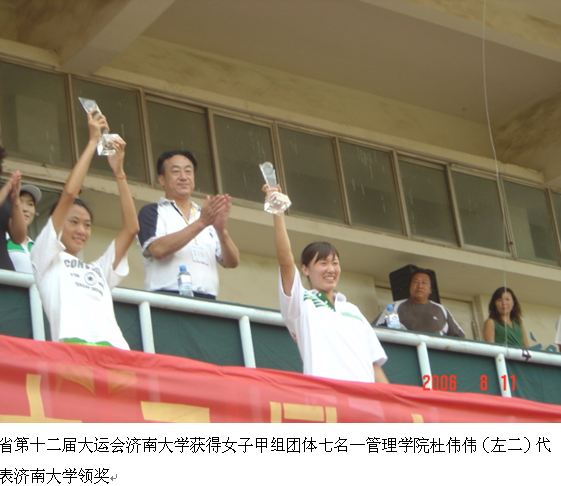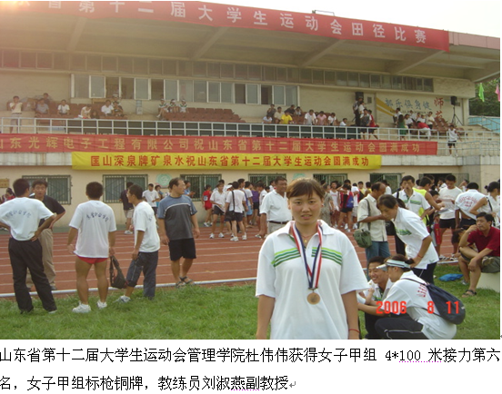 6、山东省第十二届大学生运动会社科学院马娟女子甲组400米第七名,800米第八名,4*100米接力第六名,4*400米接力第七名。
